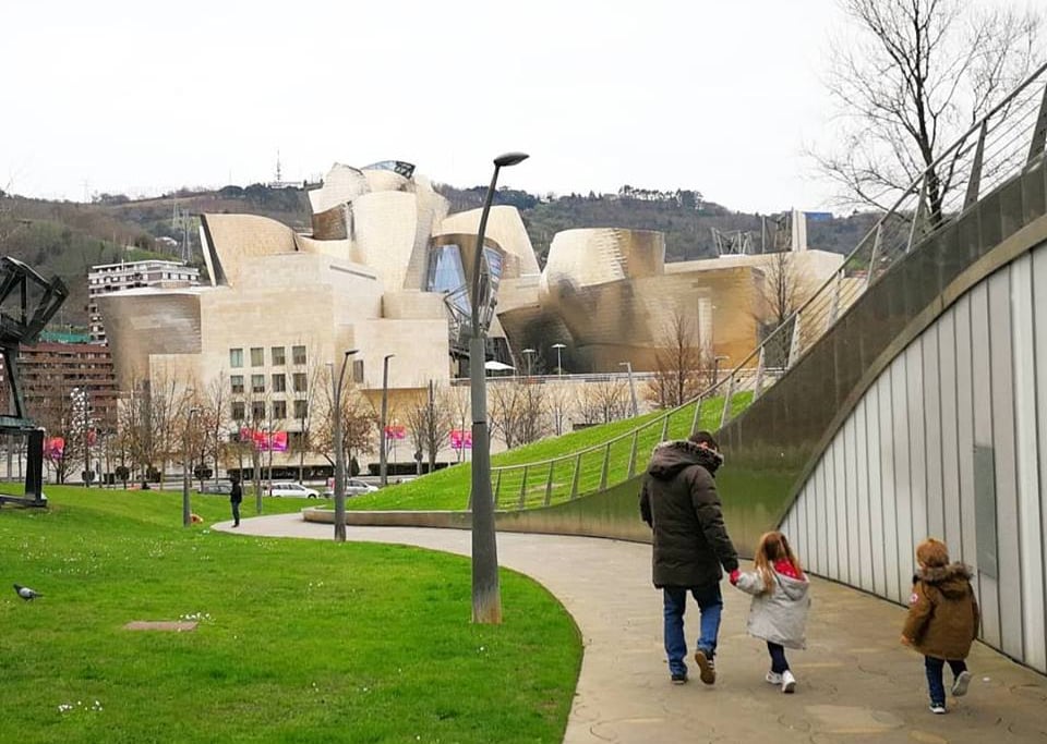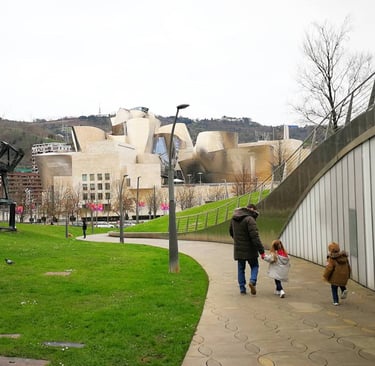 You never quite know as a tourist where is safe in a city and where is not but we had an overwhelming feeling of safety in Bilbao, and perhaps this was something to do with the huge number of kids around. There was definitely a lot more money in the city than I had imagined and the buildings and streets seemed well kept and clean. The fruit from the shops cost next to nothing in comparison to France and Stefanie and Joe gorged themselves on strawberries and tomatoes. Whilst sitting on a bench stuffing their faces they watched a lady across the street fish some cardboard from a bin and were amazed when she made a seat out of it and set herself on the side of the pavement to ask passers-by to spare a few centimes. As in any place, with money, some have it, some don't. We went over to the lady and learnt her name was Blessed and she had travelled through Africa from Nigeria in the hope of making a home there in Bilbao. Through her black skin her cheeks turned red as she explained how much she wanted to work, how she hated asking for money and how there was nothing wrong with her, she was willing and able to pay her way. But she did not have the papers. It would take another year to reach the three years residence required in order to be able to work. I reflected on my own precarious position in France, with just days from the dreaded Brexit and an interview a month later for which I may no longer have the papers required to be eligible. In Europe we have been so fortunate to be able to move and work across borders, with little regard for pandemonium paper chase and Kafkaesque corridors of hoops to jump through. Others have not been so fortunate. And soon I may not be either. We helped her buy some food to see her through a few days and made our way back to the Guggenheim via the tram. Between the tram tracks were beds of daisies and the soft green hills surrounding the museum led to Phill declaring to the kids that we were in Tellytubby land. It certainly did seem like it. With the museum's soft, curvy shape and the multicoloured buildings all around, the picture was certainly something somehow surreal, not dissimilar to the Teletubbies. The sun was peeping its head and the birds took the place of the rabbits, dotted around the park (yes, another kids' park), the water fountain challenge of water bursts from the ground and the mist of water surrounding the shiny metal bendy building, home to world famous modern art. Joggers jogged by and bike-riders rode over bridges. The saxophonist tooted his tune and the tourists tapped their phones to frame the picture. It was just cool. I definitely want to go back.