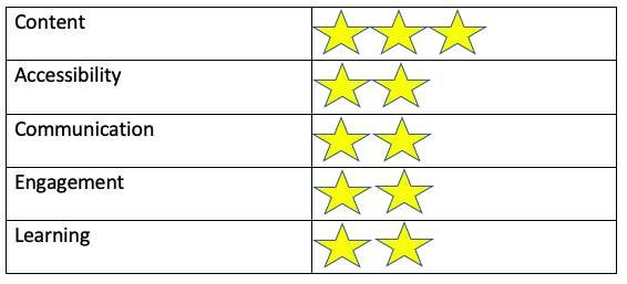 Here's a summary of scores awarded using our CACEL criteria, based on criteria for selecting digital tools/materials by Kidd (2019) at Cambridge's World of better learning. The stars are awarded out of a potential 5 for each criterion.