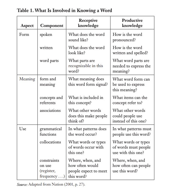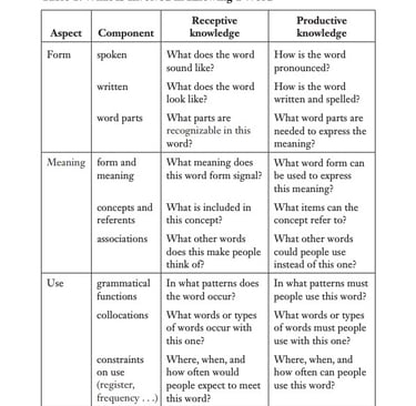 Learning a new word can be quite easy if we help ourselves by using learning strategies such as the sticky notes. However, when we think deeply about what is involved in truly knowing a word, there is actually quite a lot to it. Perhaps one of the greatest scholars in the field of second language acquisition is Paul Nation and he offers this breakdown of what information we might need to know if we truly wish to be able to say we 'know' that word.