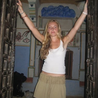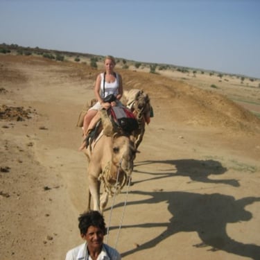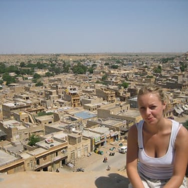 Jo was having curry for breakfast again. It was the third day running. The naan bread squashed like dry dough between her fingertips as she pinched it together to pick up the peas and paneer cheese that squeaked a little between her teeth. Strangely, at home on Manchester’s curry mile everything except for the coconut korma was too spicy but here in India, she found her taste buds tantalised, but not eye-wateringly so. As she wiped up the curry from her plate with the bread, she took in the morning view. All around was the dawn-time glow of the Golden City, Jaisalmer of Rajasthan, the region spanning the top northwest tip of this huge, hot, upside-down pyramid.